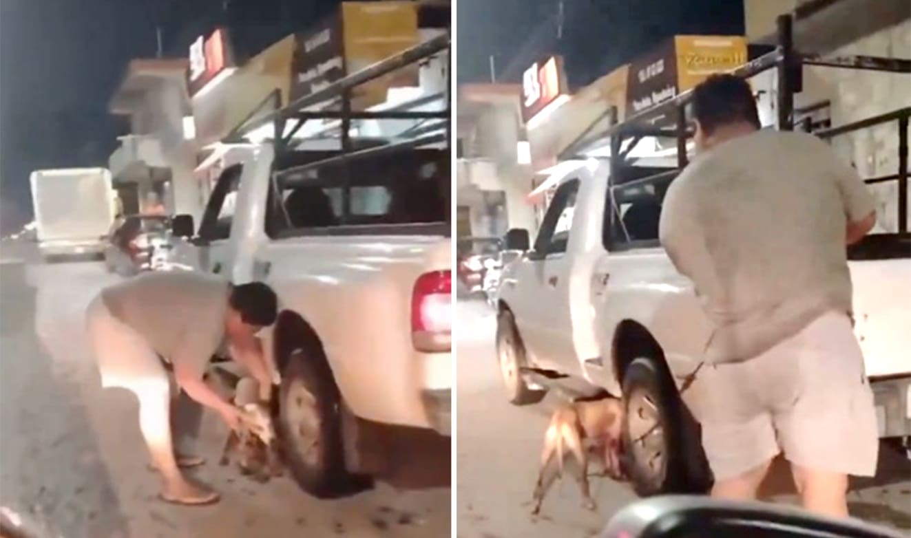 En el material gráfico se ve una camioneta blanca arrastrando a la perrita de color café claro y manchas blancas, atada con una cuerda al vehículo.