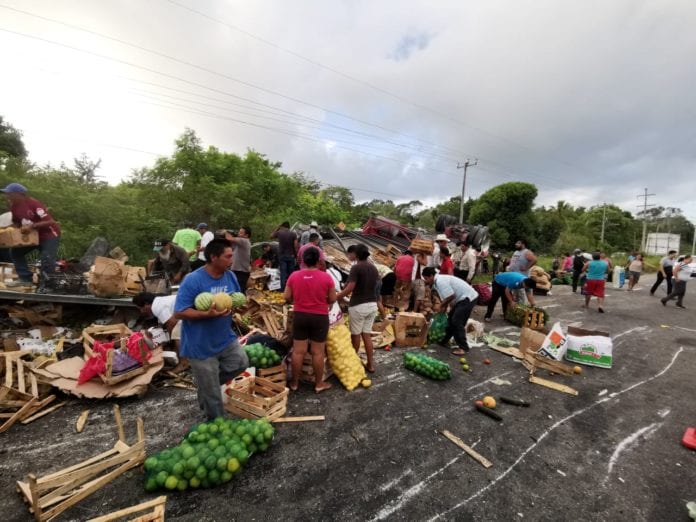 Chetumal.- Esta mañana en la capital del estado se produjo un aparatoso accidente en el que volcó un tráiler cargado con frutas y verduras; por fortuna no hubo lesionados aunque tal como ocurre en esta clase de accidentes la gente que pasó por el sitio se detuvo para hacer rapiña con los productos regados a la orilla del camino.