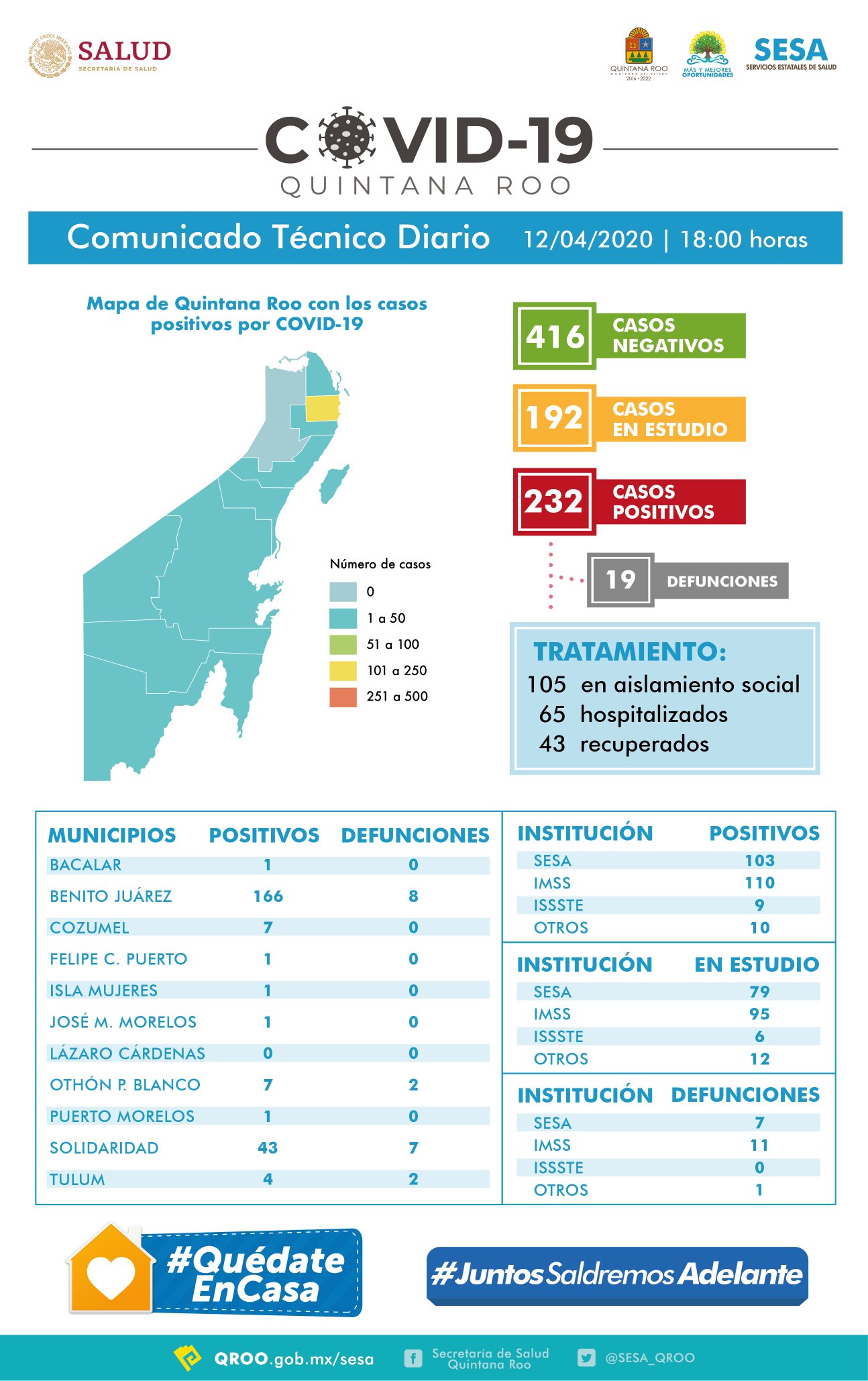 Por municipios, con 166 positivos confirmados, Benito Juárez concentra el 71.5% de los casos en el estado. Solidaridad, con 43, tiene un 18%; el resto de los municipios tienen números de una cifra, incluido José María Morelos, que hoy registra su primer paciente confirmado con COVID-19.