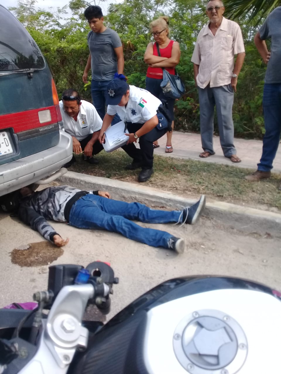 Paramédicos de la Unidad de Respuestas a Emergencias Médicas (UREM) debieron sacar al conductor de la moto de debajo de una van estacionada, para llevárselo con su acompañante al hospital del ISSSTE.