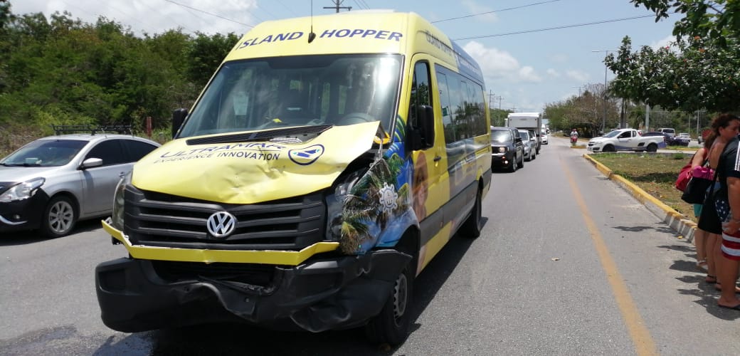Playa del Carmen.- Una van de Ultramar que llevaba a turistas al muelle para cruzar a Cozumel se estrelló por detrás contra un automóvil particular, quedando dos personas lesionadas. Pasajeros aseguran que el chofer venía texteando por el celular y no vio al vehículo detenido adelante.