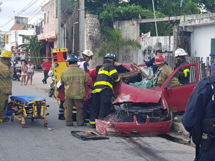 Cancún.- Una mujer quedó prensada por 20 minutos, luego que un vehículo Seat chocó de frente con un camión de tipo revolvedora, esta mañana sobre la avenida Bonampak de esta ciudad.
