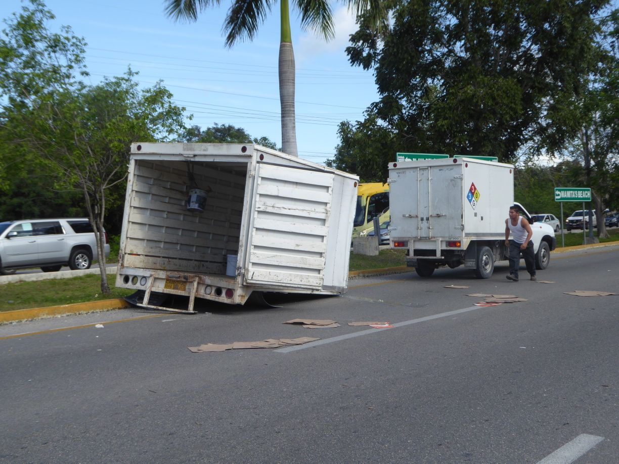 Playa del Carmen.- Una persona lesionada generó un fuerte choque entre dos camiones a la entrada de Playa del Carmen esta tarde.
