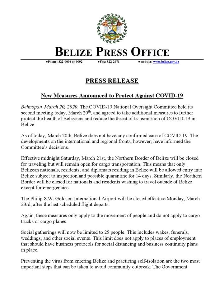 A través de un comunicado, el gobierno vecino resalta que hasta el momento carecen de casos de COVID-19, algo que desean preservar. Con base en este medida, solo beliceños, residentes o diplomáticos podrán ingresar al país, y solo después de un periodo de 14 días de cuarentena.