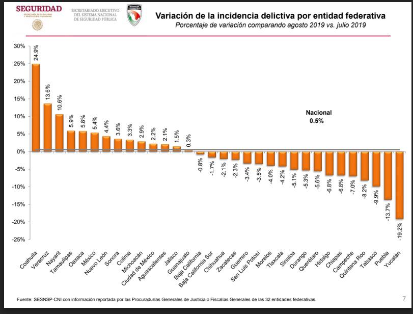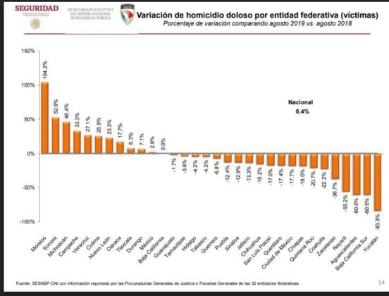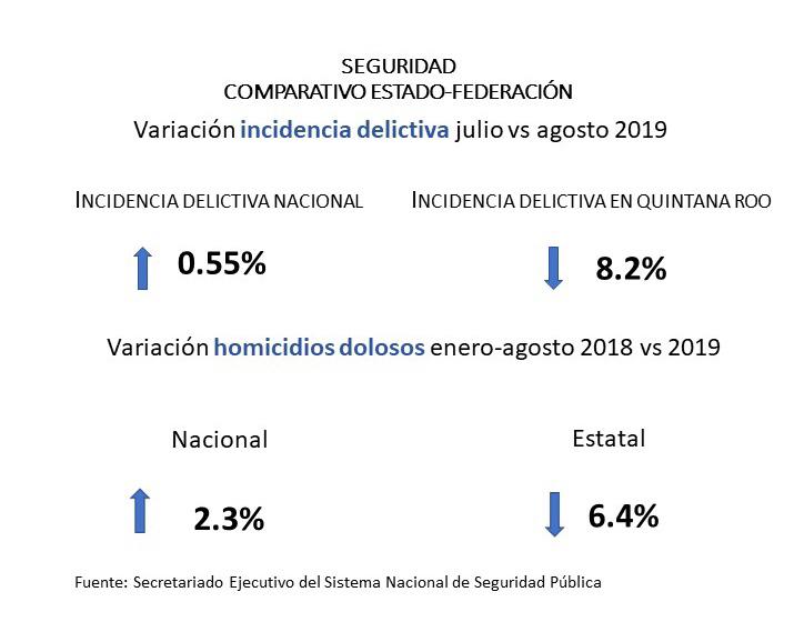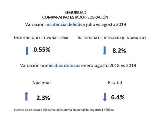 Entre enero y agosto, en los Estados Unidos Mexicanos, la incidencia delictiva aumentó un 0.55%, y el índice de homicidios un 2.3%; en contraste, en Quintana Roo la comisión de delitos bajó en un 8.2%, y los asesinatos dolosos se redujeron en un 6.4%.