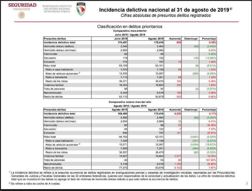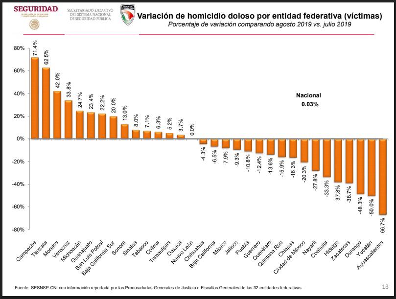En cuanto a homicidios, de julio a agosto, el número de víctimas se redujo en un 15.9%; además de ser esta cifra un 20% menor a la de agosto del año pasado.