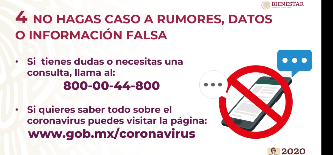 Para cualquier duda o alguna consulta está disponible el teléfono 8000044800. De igual forma, si quieres saber sobre el coronavirus puedes visitar la página www.gob.mx/coronavirus.