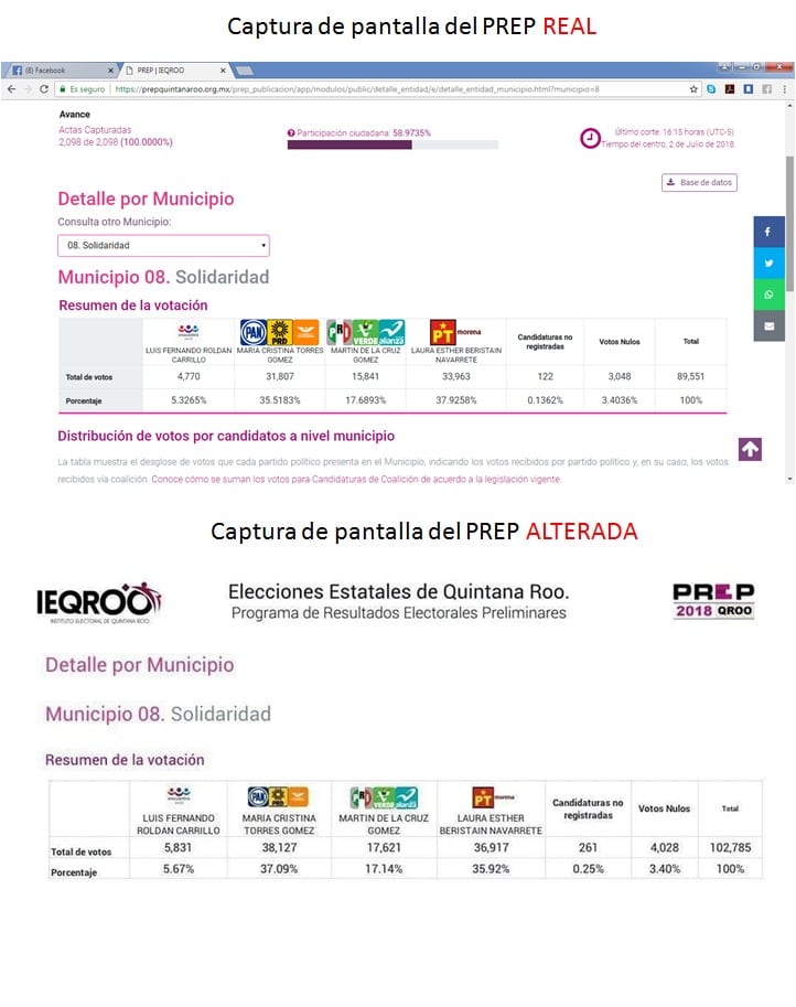 Playa del Carmen.- Desde el inicio de la tarde de hoy, en grupos de Whastapp y redes sociales comenzó a circular una imagen falsa del Programa de Resultados Electorales Preliminares (PREP) que daban una ventaja a Cristina Torres Gómez.