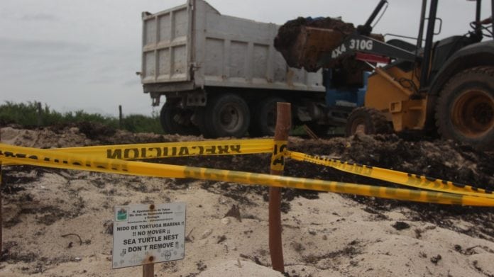 Esta acción ocurre mientras en otro lugar del municipio, en la zona hotelera, la remoción de esta alga ocurre con maquinaria pesada, igualmente junto a nidos de tortuga que no deben ser perturbados con estos trabajos.
