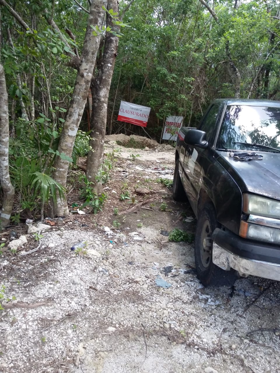 El predio donde se pretende construir un conjunto habitacional llamado “DeLux”, se ubica en el rancho “Palancar Norte”. Una camioneta fue estacionada en el lugar para tapar el cártel de clausura impuesto por la Profepa. En el lugar se ve un nuevo camino de acceso, de 1.5 kilómetros de largo, por cinco metros de largo.