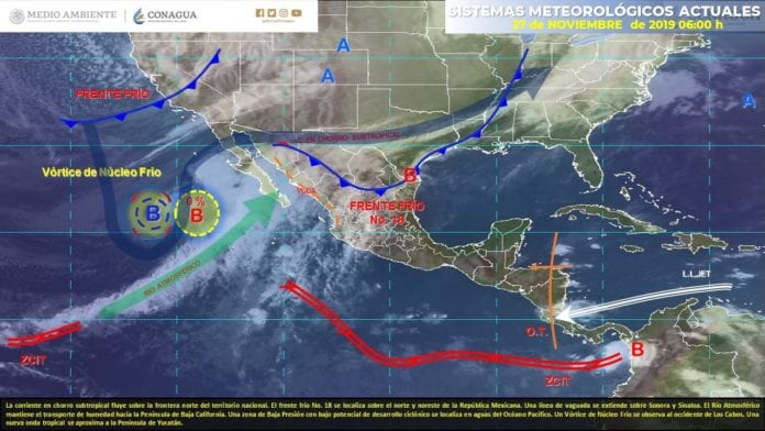 Playa del Carmen.- El frente frío 18 se encuentra próximo a la línea de costa de Tamaulipas y Texas. Se pronostica que en las próximas horas al llegar a las aguas del noroeste del Golfo de México comience a estacionarse. La masa de aire polar que lo impulsa observa una máxima barométrica de mil 22 milibares sobre Colorado, desde donde favorece temperaturas frías en los estados del norte del país.
