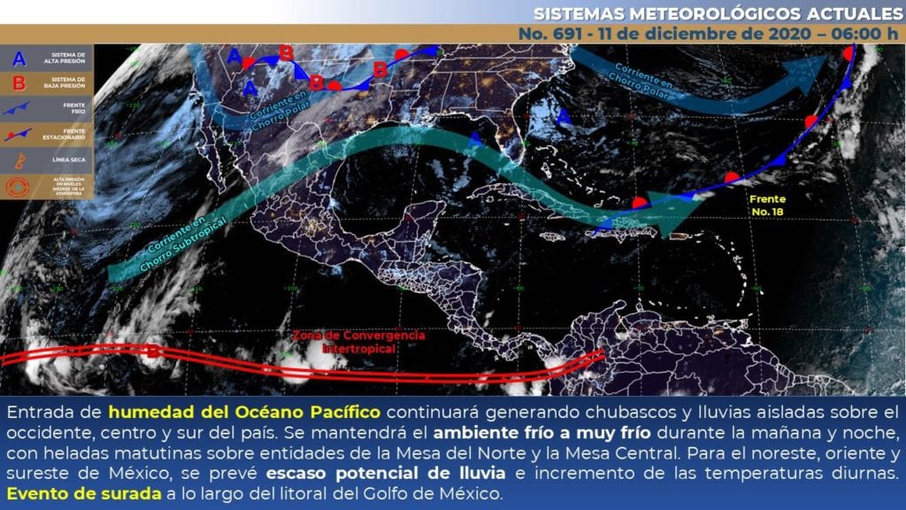 Prevalecerá ambiente frío a muy frío durante la mañana y noche, con heladas matutinas sobre entidades de la Mesa del Norte y la Mesa Central; mientras que, para el noreste, oriente y sureste de México, se prevé escaso potencial de lluvia e incremento de temperaturas.