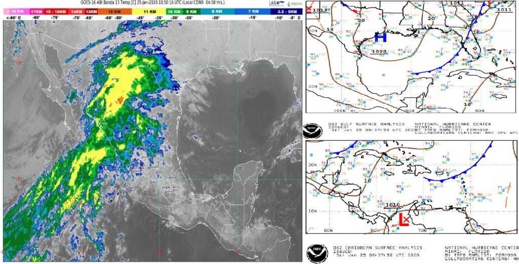 Chetumal.- El Servicio Meteorológico Nacional informó que se mantienen remanente de la Masa de Aire frío Polar Continental Muy Modificada, sobre el centro-sur del Golfo de México, así como, en la Región Peninsular y estado de Quintana Roo, interacciona con entrada de Aire Marítimo Tropical con poco contenido de Humedad del Mar Caribe, lo que provoca temperaturas frescas, nubosidad variable, lluvias aisladas, más frecuentes sobre las porciones central y sur del estado de Quintana Roo.