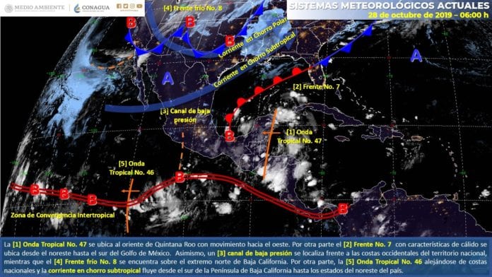 Esta onda tropical atraviesa el norte del estado con lentitud, a 9 kilómetros por hora hacia el oeste, por lo que se esperan lluvias frecuentes en Yucatán, y dispersas en Quintana Roo.