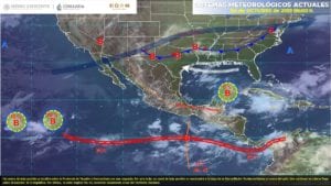 La amplia circulación ciclónica mantiene afluencia de aire marítimo tropical con gran contenido de humedad y según se mueva el sistema hacia la Sonda de Campeche incrementarán las tormentas y chubascos en el sureste del país.