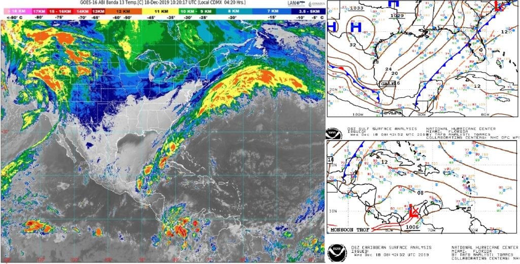 Agrega que la Vaguada (Canal de Baja Presión), fortalece condiciones de cielo nublado, lluvia con chubascos y posible actividad eléctrica, sobre la Región Peninsular y Estado de Quintana Roo.