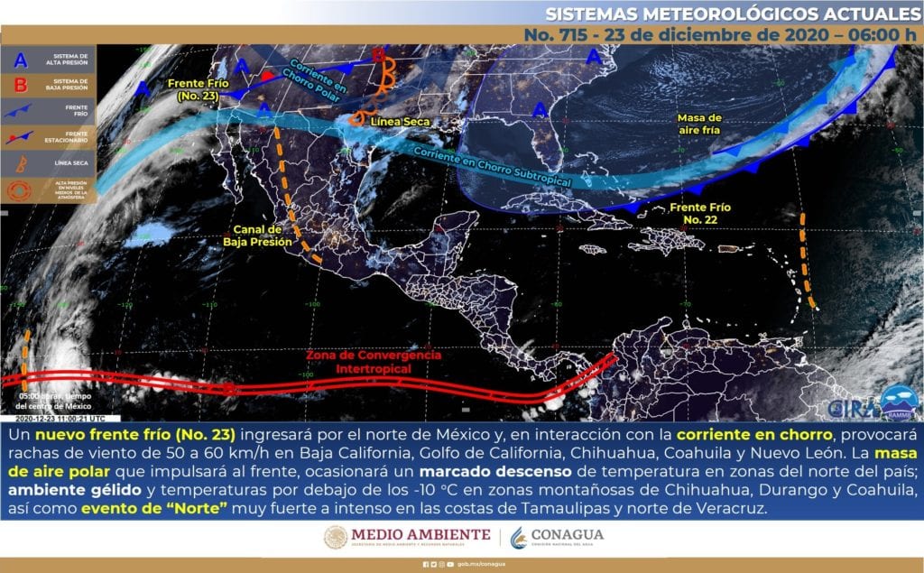 Se prevé que este sistema frontal se aproxime mañana al Golfo de México y que por la tarde cruce sobre la Península de Yucatán, acompañado de un evento norte con rachas huracanadas y un ambiente frío a gélido de forma puntual esta Navidad.