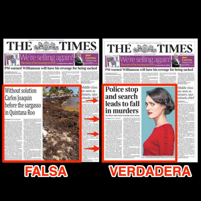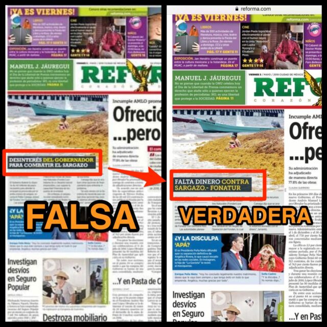 Estas fake news incluyen portadas de medios nacionales e internacionales, que han sido clonadas, para tergiversar la información y plantear que el gobierno estatal no combate el sargazo.
