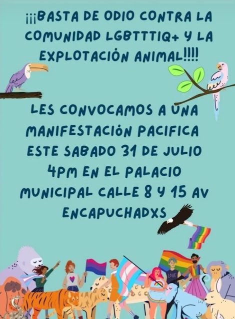 Por lo mismo activistas convocan a una protesta pacifica afuera de Animalandia el día Sábado 31 de Julio al medio día, para levantar la voz por toda la comunidad LGBTTTIQ de Playa del Carmen y los animales drogados y obligados a tomarse fotografías con turistas que pagan mas de 800 pesos.