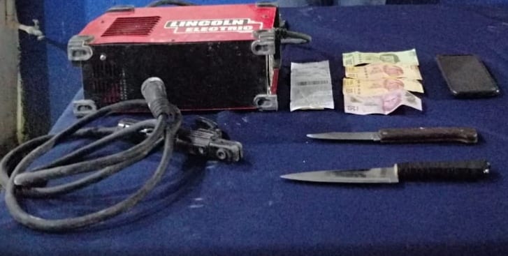 Con las características que describió a los uniformados comenzaron un operativo de búsqueda con el que lograron localizarlo, asegurándole el producto del delito, una máquina de soldar, un celular, 450 pesos en efectivo y 2 armas blancas.