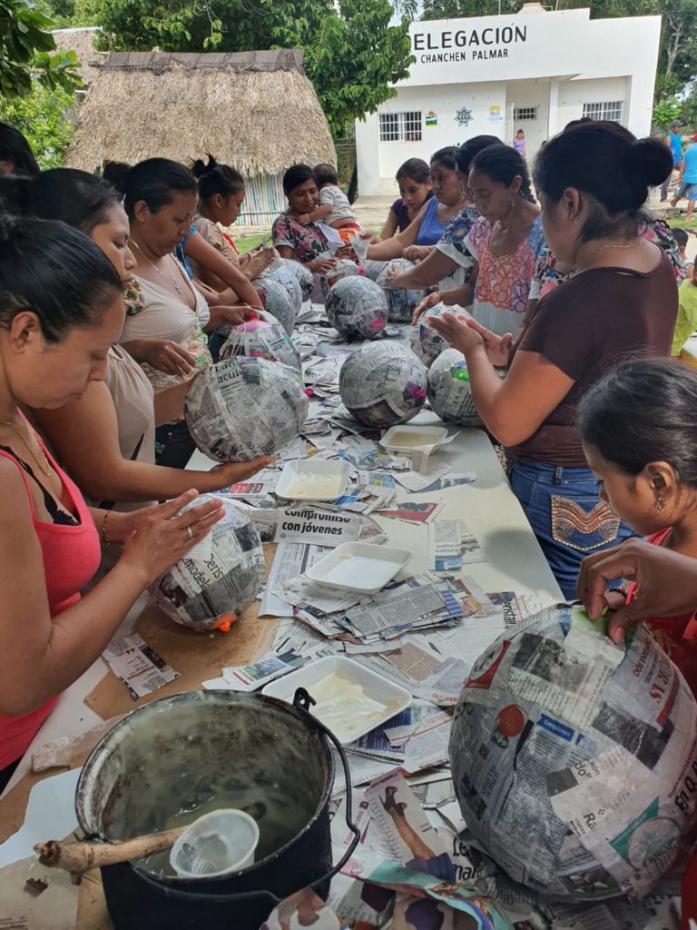 Tulum 15 de Noviembre del 2020.- Brigadistas del H. Ayuntamiento de Tulum, en representación del Presidente Municipal Víctor Mas Tah, visitan la comunidad y la Delegación de Chanchen Palmar llevando diferentes actividades como la limpieza del parque, caleado de árboles, donación de equipo de sonido, material deportivo y curso de elaboración de piñatas navideñas.