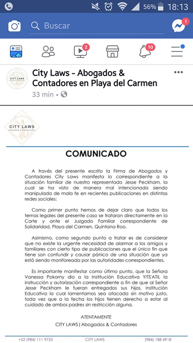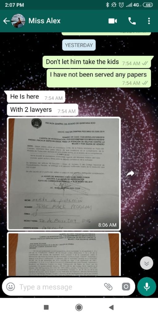 A pesar de existir una captura de pantalla de WhatsApp de la conversación entre la madre y una de las profesoras, donde la primera le pide a la segunda no dejar a sus hijos en manos de su padre Jesse Peckman, la firma de abogados que lo defiende insiste al igual que el colegio, que la madre autorizó al señor Peckman para que se llevara a los niños de la institución.