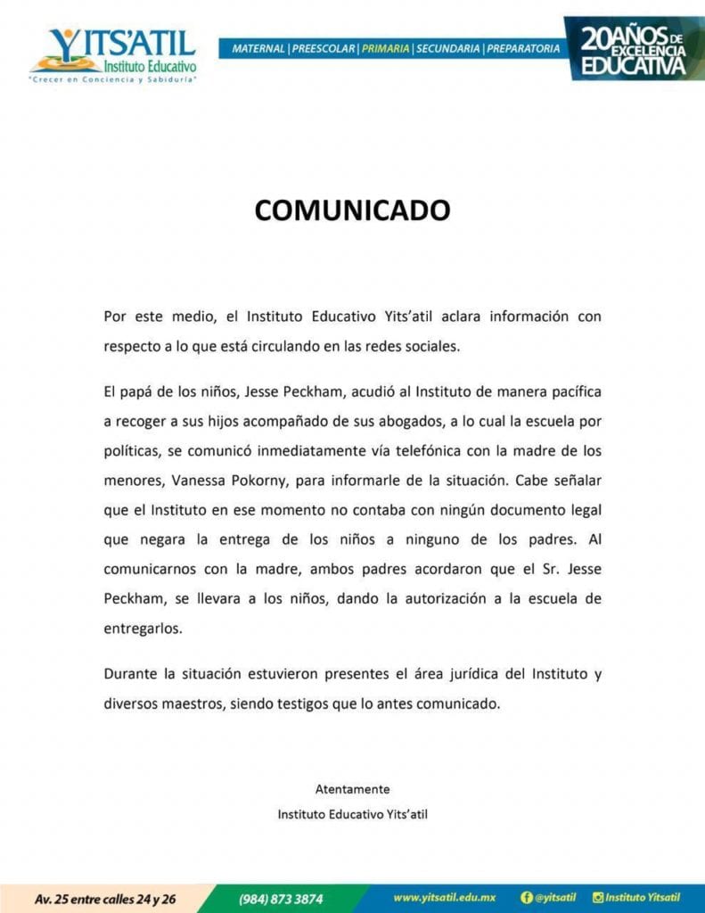 En un comunicado, la escuela afirma que le avisaron a la madre de la situación y que por común acuerdo entre los padres, se decidió entregarlos al padre, lo que la mujer asegura que es falso, pues incluso tiene mensajes por Whatsapp en los que pide no entregarlos.