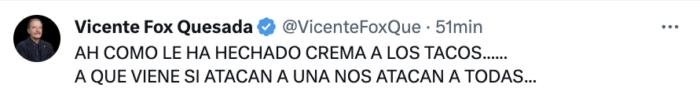En respuesta, Fox Quesada expresó: Ah como le ha hechado (SIC) crema a los tacos. a que viene si atacan a una nos atacan a todas.