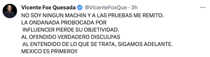“No soy ningún machín y a las pruebas me remito. La ondanana provocada (SIC) por influencer pierde su objetividad. Al ofendido verdadero disculpas al entendido de lo que se trata, sigamos adelante. México (SIC) es primero”.