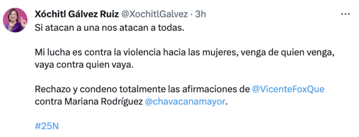 En otra publicación en X, se lanzó contra la precandidata presidencial del Frente Amplio por México, Xóchitl Gálvez Ruiz, luego que esta condenara los comentarios del guanajuatense contra Mariana Rodríguez.
