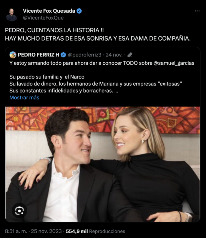 En un mensaje publicado a las 8:51 horas del pasado sábado, Vicente Fox respondió a un mensaje de Pedro Ferríz Hijar en el que compartió una fotografía de Samuel García junto a Mariana Rodríguez.