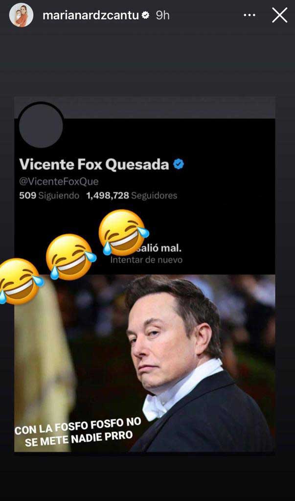 Mariana Rodríguez Cantú utilizó un meme del magnate Elon Musk, dueño de la red social X (antes Twitter), para reaccionar a la desaparición de la cuenta del expresidente Vicente Fox, quien en fechas recientes la había insultado.