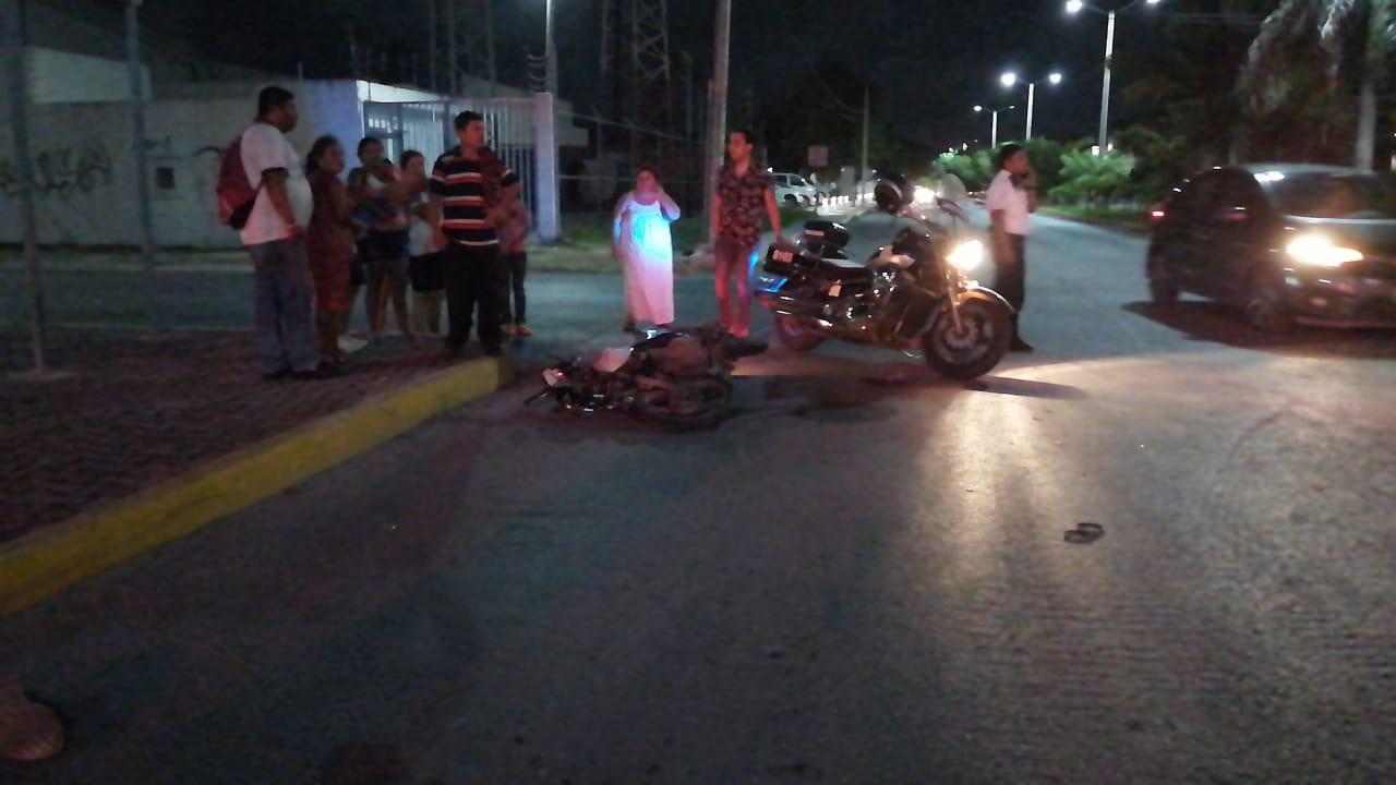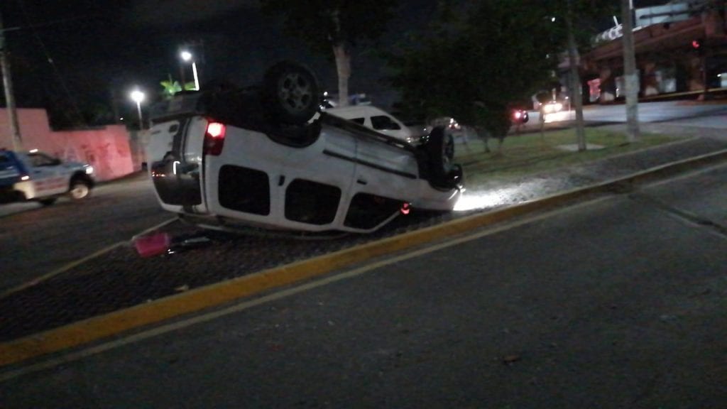 Playa del Carmen.- El conductor de una camioneta, que circulaba en estado de ebriedad, atropelló a un repartidor de periódicos que iba en motocicleta, en la lateral del bulevar Playa del Carmen, con avenida 38, antes de acabar volcado.