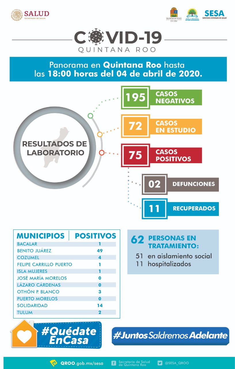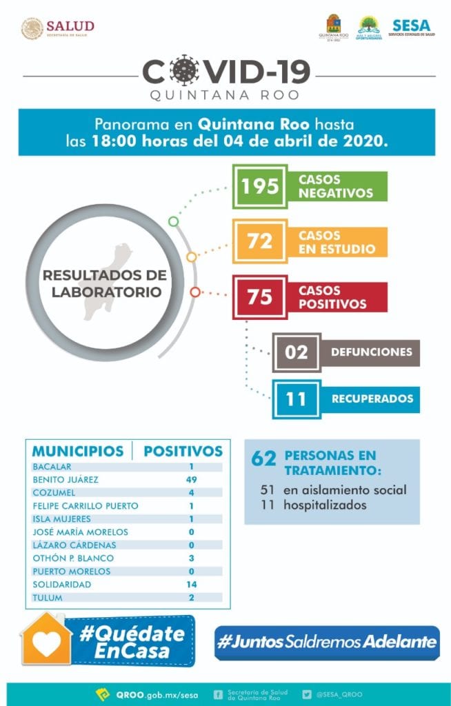 Al corte de las 18:00 horas de este 4 de abril las autoridades de Salud de Quintana Roo confirman la segunda muerte por coronavirus en el estado, la cual habría ocurrido en Chetumal, capital del estado.