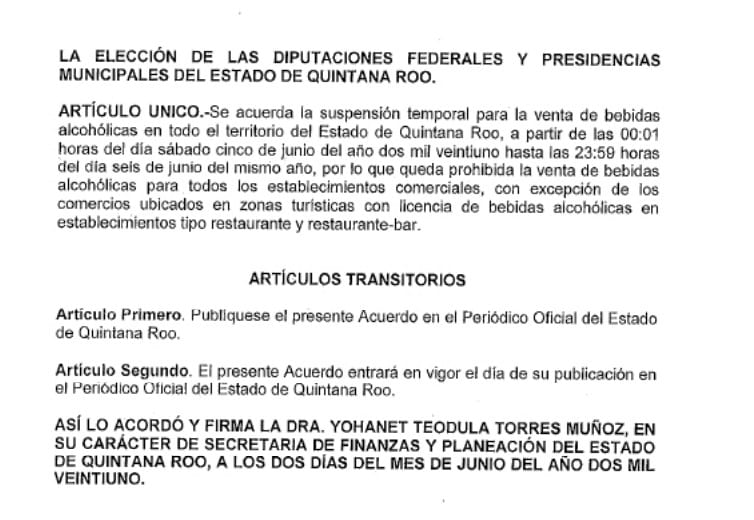 Chetumal (AGENCIA SIM).- Hoy fue publicado el decreto para la suspensión temporal de la venta de bebidas alcohólicas en todo el estado, con motivo de la jornada electoral del próximo domingo 6 de junio, en la que los ciudadanos eligirán diputados federales y presidentes municipales.