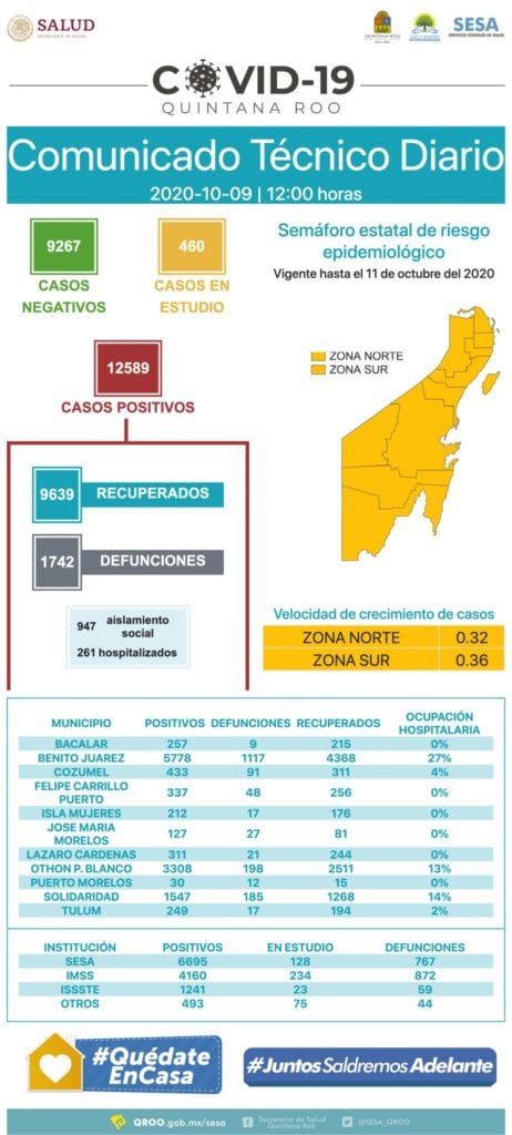 De acuerdo al último comunicado técnico diario de la Secretaría de Salud estatal, a la fecha Quintana Roo ha tenido 12 mil 589 casos confirmados de COVID-19, de los cuales mil 742 pacientes han fallecido, 261 están hospitalizados, 947 permanecen en aislamiento social y 9 mil 639 ya se recuperaron.