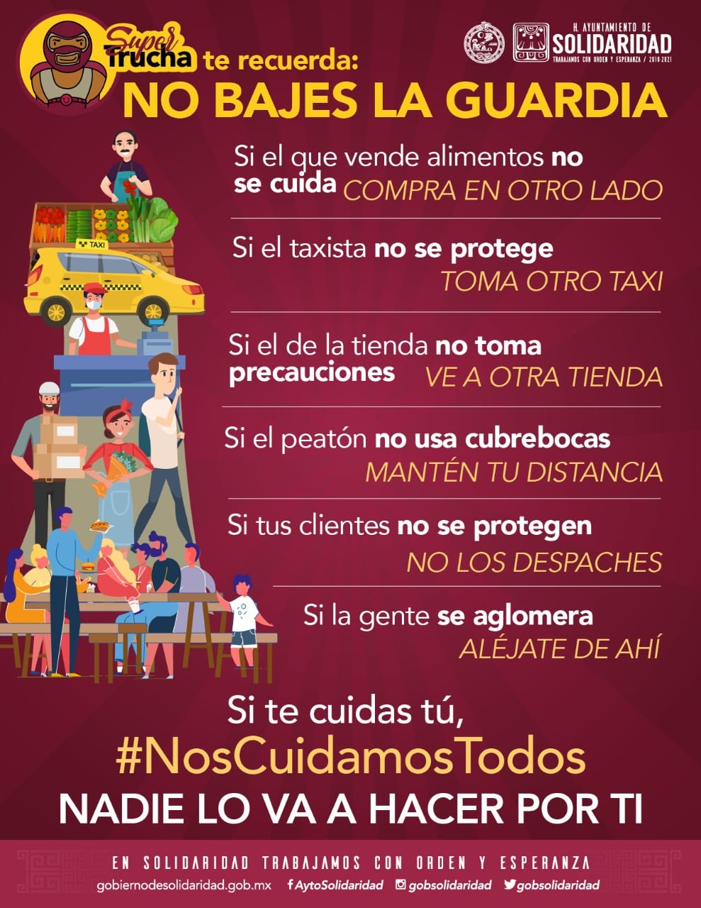 A través de la imagen de un personaje de lucha libre, “Súper Trucha”, el Ayuntamiento de Solidaridad, promueve acciones responsables para la nueva realidad, recordando a los solidarenses que la reapertura gradual de las actividades no implica el fin del coronavirus, por lo que es importante no bajar la guardia con las medidas de cuidado personal para evitar una nueva ola de contagios.