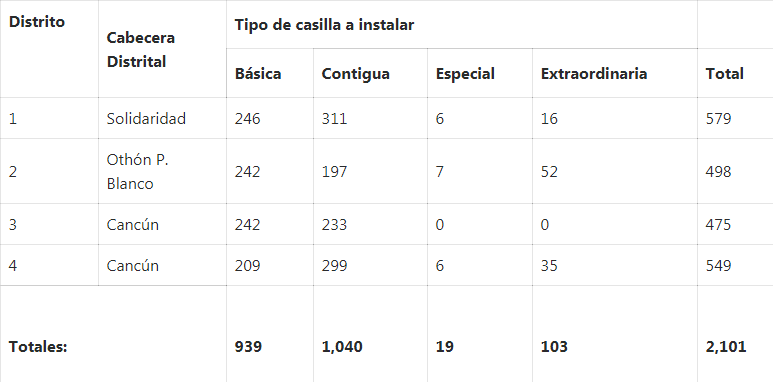 Cabe recordar que el INE en Quintana Roo, instalará el día de la elección 2 mil 101 casillas electorales, dividas en cuatro distritos, para la jornada del próximo primero de julio.