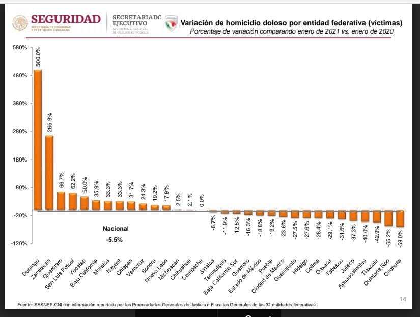 Comparando enero de 2021 con el mismo mes de 2020, los homicidios dolosos disminuyeron 55.2% en la entidad. Con este porcentaje Quintana Roo se ubica como el estado del sureste de la República con la mayor disminución de víctimas y segundo a nivel a nacional, sólo abajo de Coahuila.