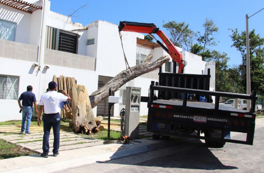 La Presidenta Municipal dijo que de igual manera continúan atendiendo llamados ciudadanos para retirar árboles caídos y que en algunos casos dañaron estructuras en domicilios particulares, como el coralillo de 12 metros de altura que se cortó hoy en el fraccionamiento Villas Marino, que afectó una barda en el techo de la vivienda.