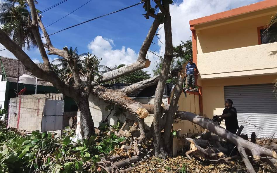 También en la avenida Niños Héroes, en el Casco Antiguo, retiraron dos almendros de gran tamaño que se vinieron abajo sobre una casa. Solo la Dirección de Bomberos ha recibido 87 reportes para corte y poda de árboles luego del ciclón.