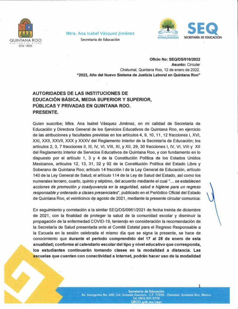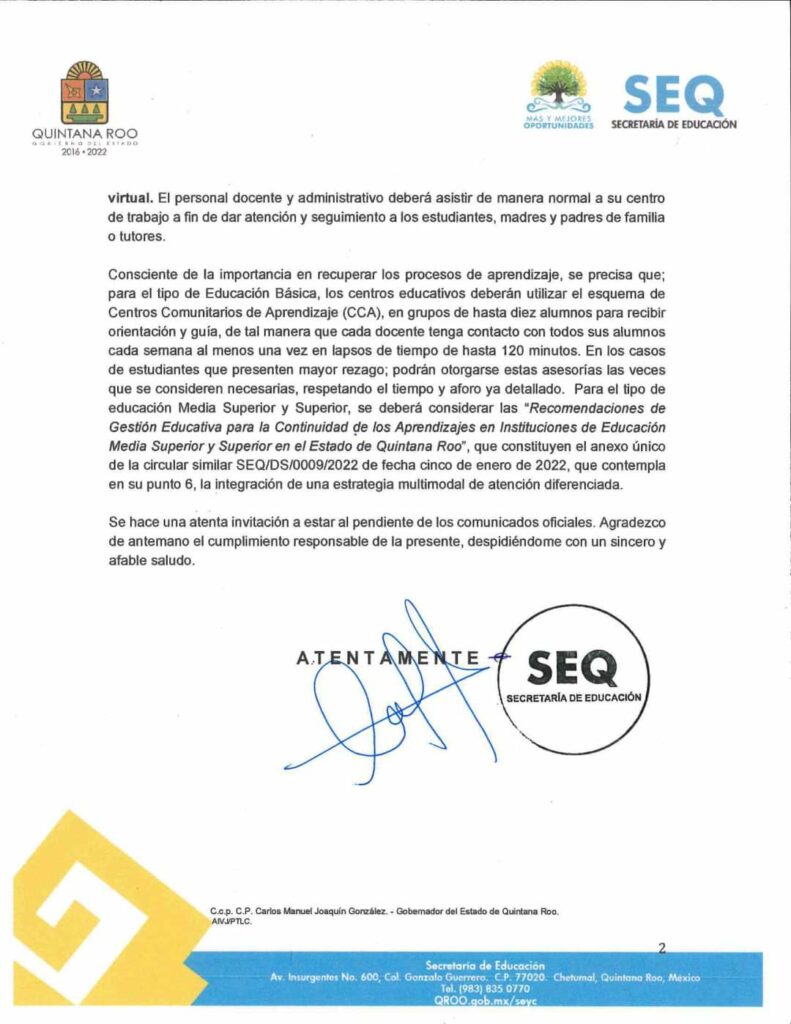 “Para Educación Básica, los centros educativos deberán utilizar el esquema de Centros Comunitarios de Aprendizaje (CCA). Para Educación Media Superior y Superior ‘Las Recomendaciones de Gestión Educativa para la Continuidad de los Aprendizajes en Instituciones de Educación Media Superior y Superior en el Estado de Quintana Roo’,” indica la instancia.