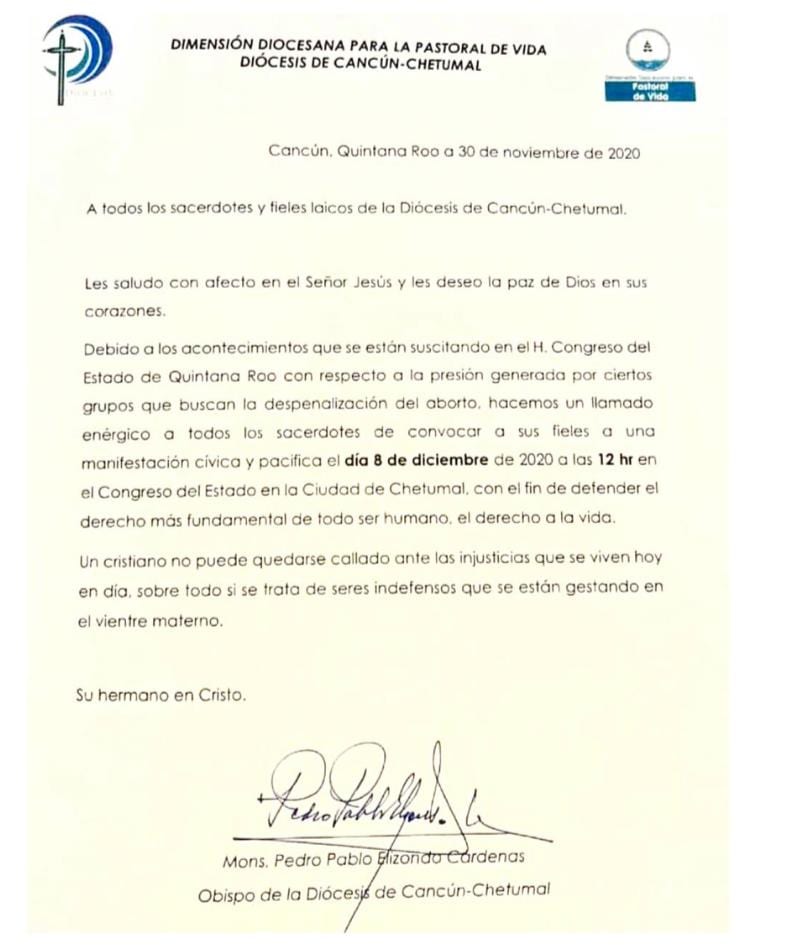 A través de un breve comunicado, el obispo dijo que lo anterior es con el fin de defender el derecho más fundamental de todo ser humano, que es el de la vida.