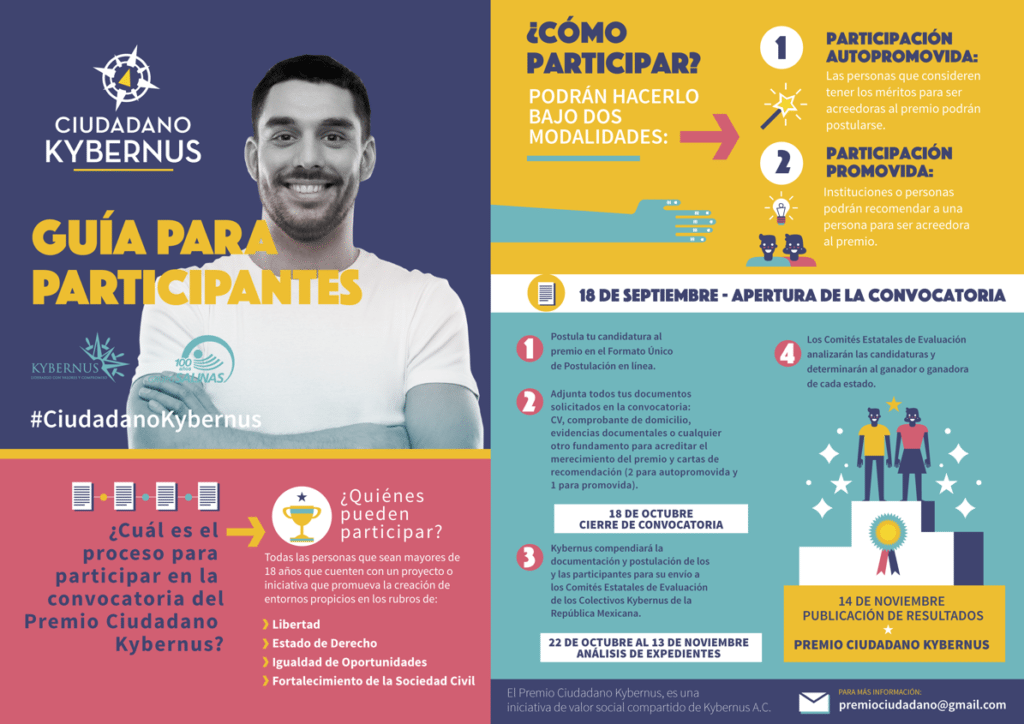 En rueda de prensa, Miguel Rosales, integrante del Colectivo Kybernus Quintana Roo, anunció que la convocatoria estará abierta hasta el 18 de octubre, con posibilidad de autopostularse o postular a una persona, que creas que sería el candidato para obtener el premio de Ciudadano Kybernus.