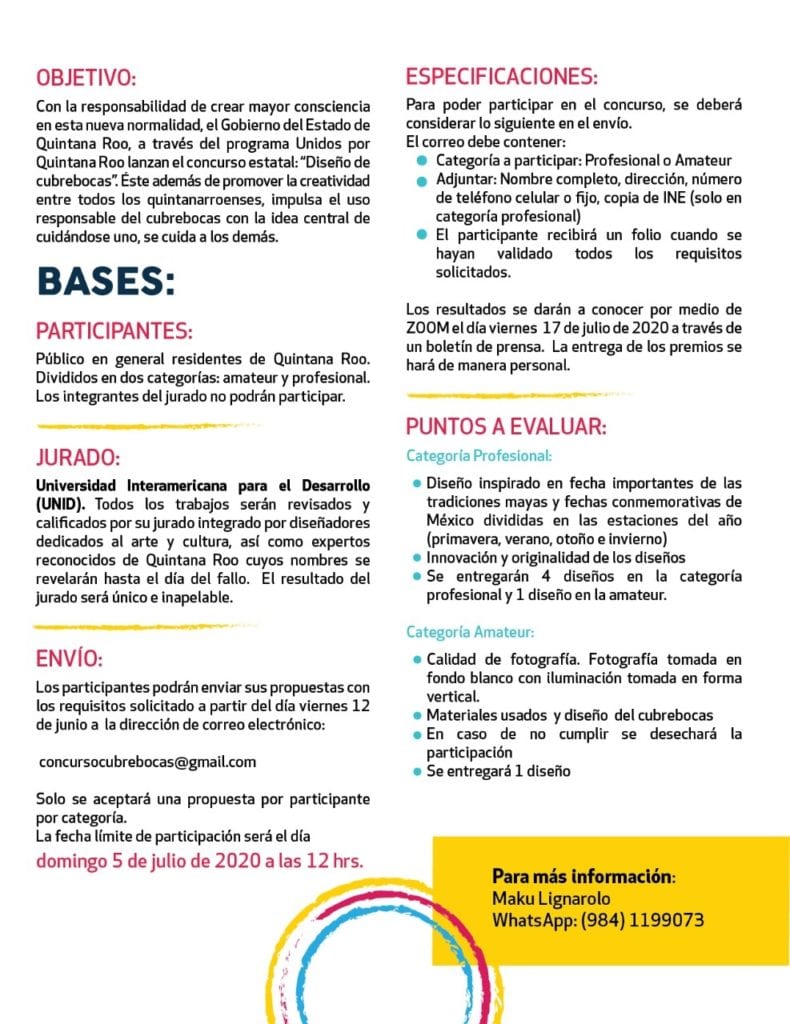 En la rueda de prensa se informó que el concurso busca “promover la creatividad entre todos los quintanarroenses, impulsa el uso responsable del cubrebocas con la idea central de cuidándose uno, se cuida a los demás”. Pero para incentivar la participación y gratificar el trabajo de los participantes habrá fabulosos premios.