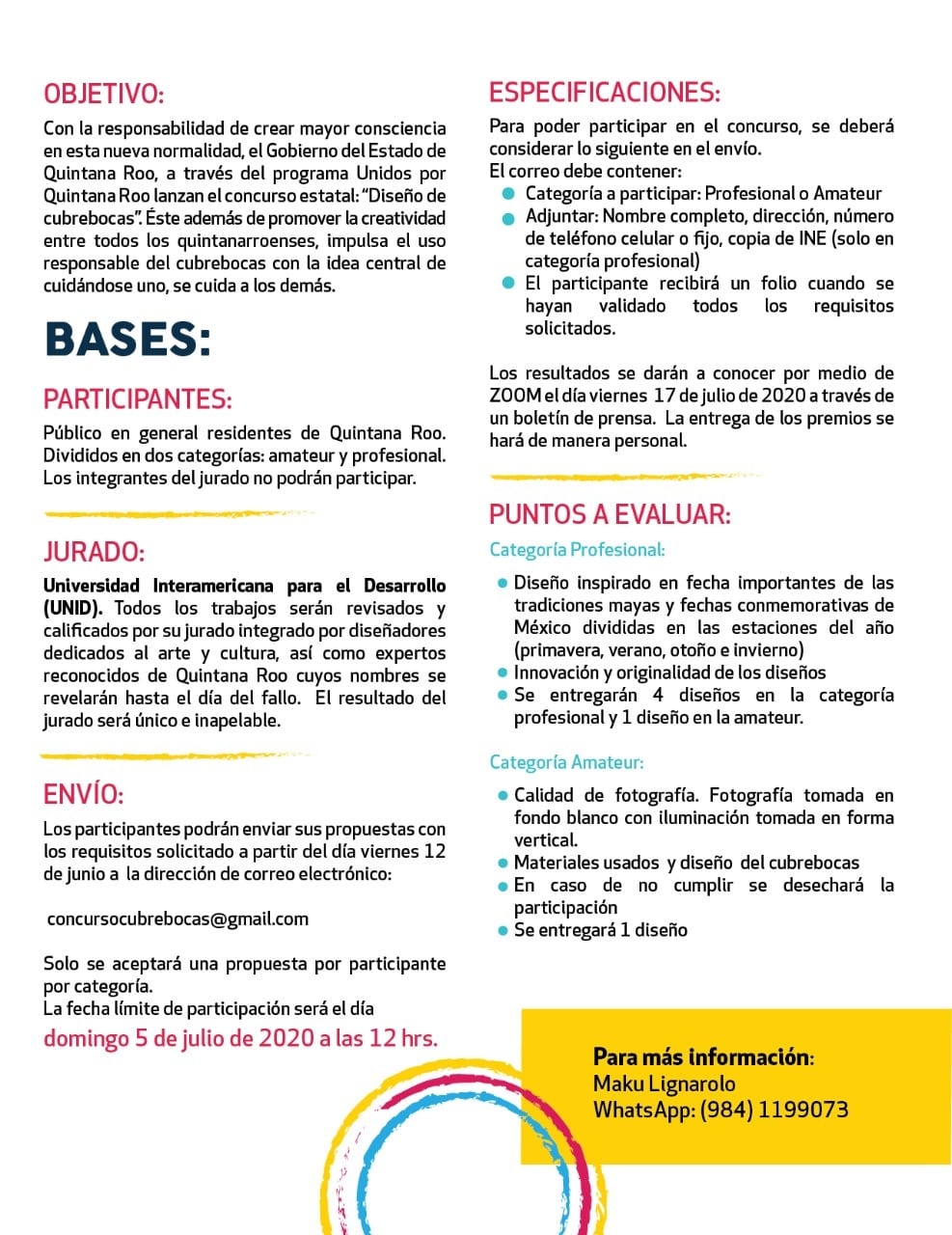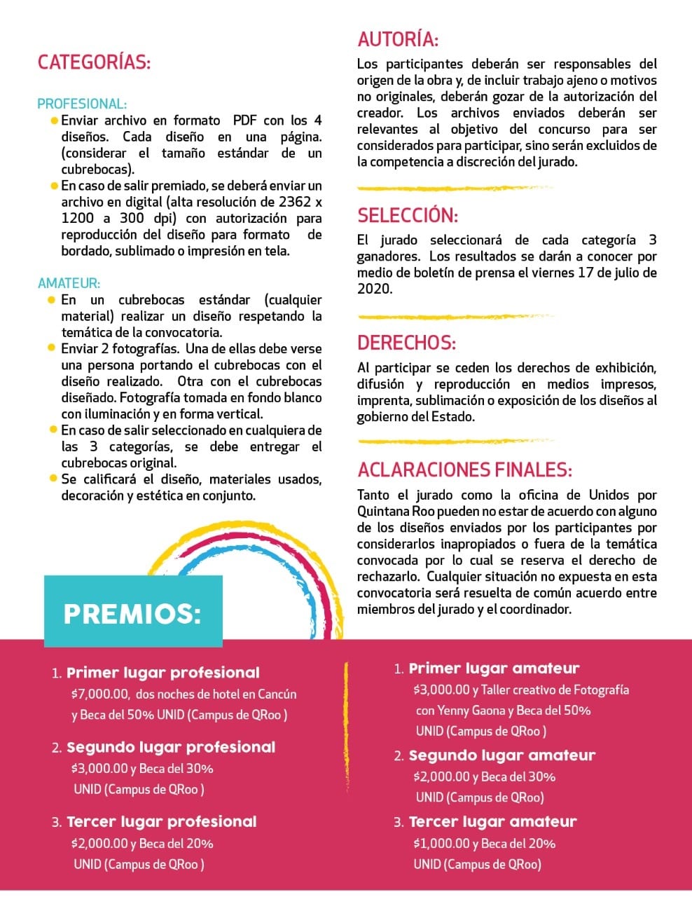 Se entregarán 4 diseños en la categoría profesional y 1 diseño en la amateur. Solo se aceptará una propuesta por participante por categoría. Los participantes podrán enviar sus propuestas con los requisitos solicitados a partir del día viernes 12 de junio a la dirección de correo electrónico: concursocubrebocas@gmail.com