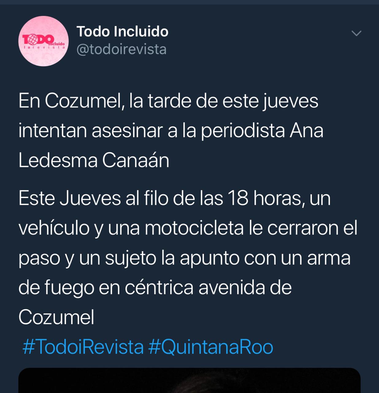 Posteriormente, a través de la cuenta de su publicación, la revista Todo Incluido, la periodista informó que se trató de un intento de asesinato, pues alguien le había apuntado con un arma de fuego.