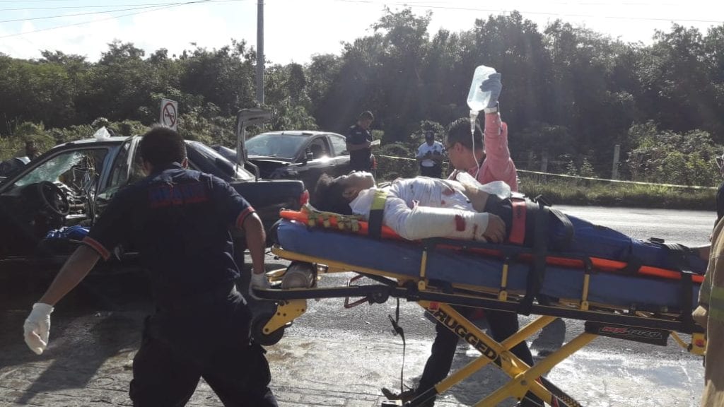 Cozumel.- Dos automóviles se impactaron de frente en la carretera perimetral, donde resultaron cinco personas lesionadas, tres de uno de los vehículos y dos motociclistas; hechos ocurridos en la carretera Perimetral, frente a la Marina Fonatur.