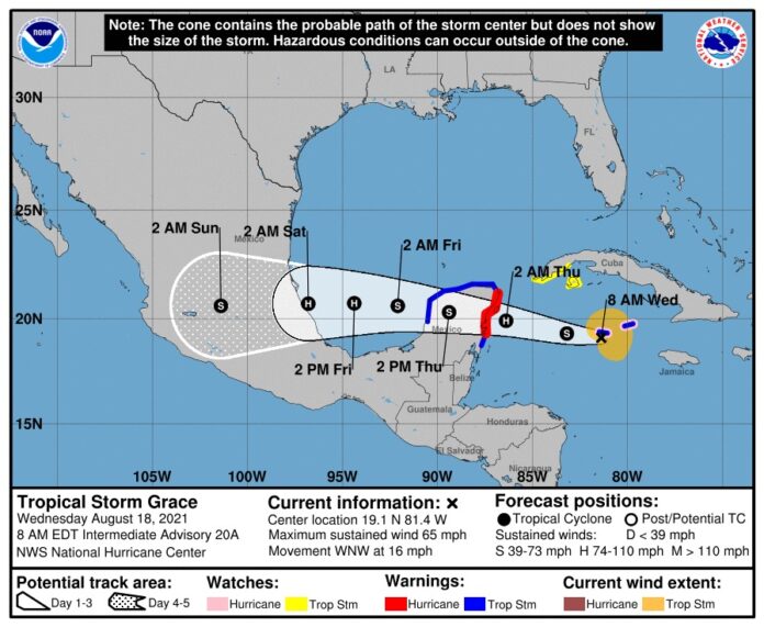 Cozumel, Quintana Roo a 18 de agosto del 2021.— Localizada en 19.1° latitud norte y 81.4° longitud oeste; aproximadamente a 650 km al este-sureste de Tulum, tiene vientos máximos sostenidos de 100 kph y Presenta movimiento al oeste rumbo 285° a 26 kph y su presión mínima central de 993 milibares.