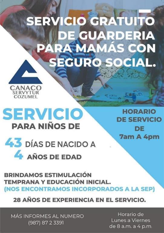 La Cámara Nacional de Comercio, Servicios y Turismo (Canaco-Servytur) de Cozumel, bajo la presidencia de Eduardo Morales Rivas, informa a las madres trabajadoras con seguridad social sobre la disponibilidad de espacios en las Guarderías Canaco U-727 y Canaco U-812, incorporadas a la Secretaría de Educación Pública (SEP), cuyos servicios son gratuitos de lunes a viernes, en horario de 7:00 a 16:00 horas.
